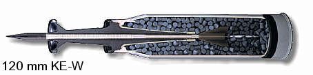 120 mm KE-Geschosse (APFSDS) Die M829 ist die erste vollständig in den USA entwickelte APFSDS Munition für die 120 mm Kanone des M1A1. Das Geschoss besteht aus einem Monoblockpenetrator aus abgereichertem Uran mit ballistischer Haube an der Penetratorspitze und einem Aluminiumleitwerk aus 6 Flügeln. Ein Führungsband aus Kunststoff dichtet den aus einer Aluminiumlegierung bestehenden vierteiligen Führungskäfig gegen das Rohr ab. Die Treibladung aus Schüttpulver wird von einem in den USA entwickelten Treibladungsanzünder M125 gezündet. Die Einführung in den Truppendienst erfolgte 1984. Die M829A1 ist eine Weiterentwicklung der M829 und bewies ihre Leistungsfähigkeit im Golfkrieg 1991 beim Einsatz gegen Kampfpanzer älterer Generationen, wie T-55, T-62 und T-72. Dabei erhielt sie die inoffizielle Bezeichnung "Silverbullet". Der Monoblockpenetrator mit ballistischer Haube und sechsflügeligen Aluminiumleitwerk besteht ebenfalls aus abgereichertem Uran. Ein Führungsband aus Kunststoff dichtet den aus einer Aluminiumlegierung bestehenden, nunmehr dreiteiligen Führungskäfig gegen das Rohr ab. Die Treibladung aus Schüttpulver wird von einem weiterentwickelten Treibladungsanzünder M129 gezündet. Als maximal effektive Einsatzschussweite werden 3000 m angegeben. Die Einführung in den Truppendienst erfolgte Ende der 80er Jahre. Die M829A2 entstand in Auswertung der Erfahrungen mit der M829A1. Das Geschoss zeichnet sich duch eine Reihe neuartiger Technologien aus. Insbesondere die Technologie zur Herstellung der Penetratoren aus abgereichertem Uran wurde zur Verbesserung der Qualität verfeinert. Die neuen Penetratoren setzen sich im Ergebnis aus SDU "Super Depleted Uranium" zusammen. Der Monoblockpenetrator wird durch eine ballistischer Haube und ein sechsflügeliges Aluminiumleitwerk komplettiert. Ein Führungsband aus Kunststoff dichtet den Führungskäfig gegen das Rohr ab. International erstmals wurde ein Treibkäfig aus einer Kohlenstoff-Epoxid-Komposition verwendet. Die Treibladung besteht aus einer Kombination von Stangen- und Schüttpulver und wird von einem Treibladungsanzünder M129 gezündet. Die Anfangsgeschwindigkeit konnte um 100 m/s gegenüber der M829A1 gesteigert werden. Die Einführung in den Truppendienst erfolgte 1992. Die M829A3 ist der Nachfolger der M829A2 und berücksichtigt die aktuellen Entwicklungen auf dem Gebiet der Entwicklung moderner Panzerungen, wie zum Beispiel die Weiterentwicklunmgen auf dem Gebiet der reaktiven Panzerungen. Die Treibladung wurde verbessert und erlaubte nun eine wesentlich höhere Energieausbeute. Weiterentwickelt wurde insbesondere die Technologie für die Herstellung von Penetrator und Treibladung. Der verbrennende Teil des Patronenkörpers wurde zur Verbesserung des Verbrennungsverhaltens optimiert. Als Treibladungsanzünder wird nun der angepasste M123A1 eingesetzt. Der Monoblockpenetrator aus abgereichertem Uran wurde mit einer verbesserten ballistischer Haube versehen und trägt am Heck ein modifiziertes, schmaleres Aluminiumleitwerk. Als maximal effektive Einsatzschussweite werden 3000 m angegeben. Die Einführung in den Truppendienst erfolgte im Jahre 2003. Die KE-W und die KE-W A1 wurden von General Dynamics ursprünglich für die von der Ägyptischen Armee eingesetzten M1A1 ABRAMS entwickelt und sind ausschließlich für den Export vorgesehen. Ihr Einsatz in der US-Armee ist derzeit nicht vorgesehen. Das offizielle Bezeichnung lautet Kinetic Energy - Tungsten KE-W. Die KE-W und die modernisierte KE-W A1 sind mit einem Penetrator aus einer Wolfram-Legierung ausgestattet. Bei der KE-W besteht das Leitwerk aus Aluminium, bei der KE-W A1 aus Stahl. Die Treibkäfige beider Geschosse sind aus Aluminium gefertigt. Die Durchschlagsleistung der KE-W A1 auf 2000 m Entfernung beträgt etwas das doppelte der Werte für die M829.