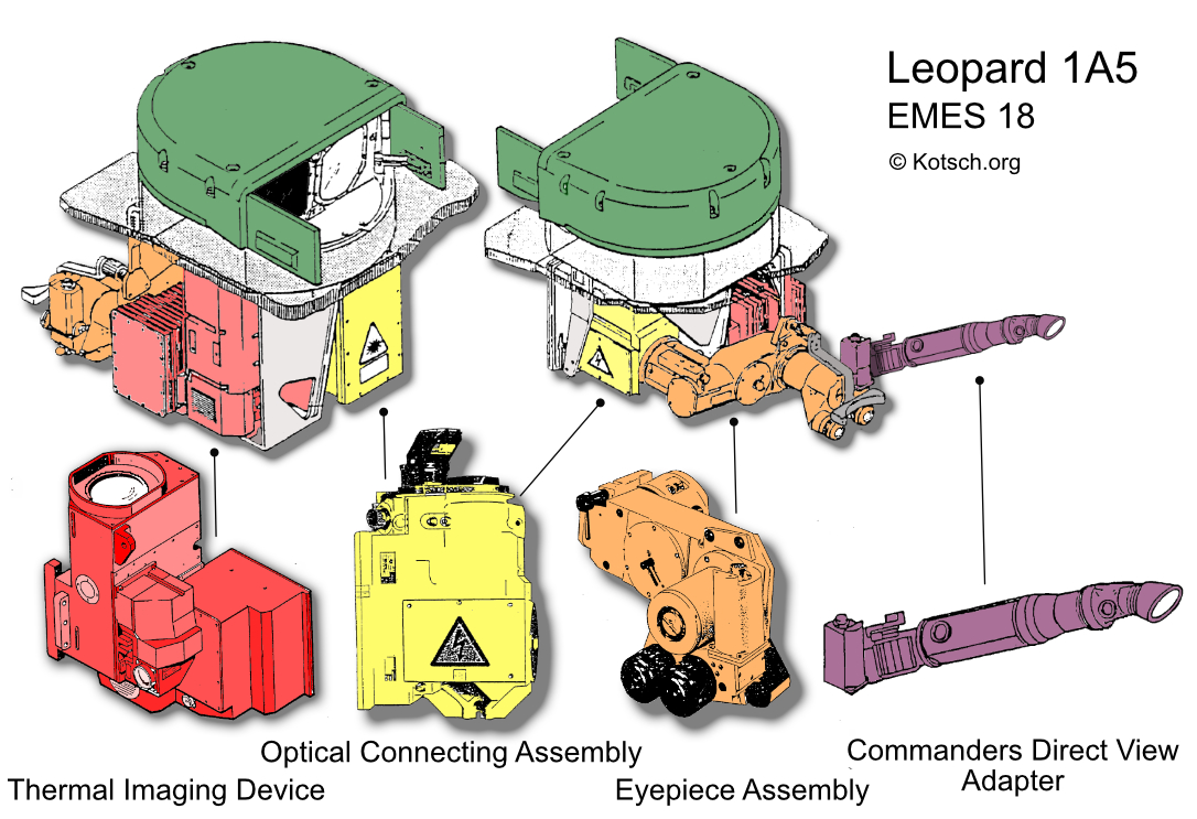 Die Feuerleitanlage des Kampfpanzers Leopard 1A5Stand 27.06.2025 Anfang der 80-er Jahre verfügte die Bundeswehr über eine große Anzahl Kampfpanzer Leopard 1 verschiedener Modifikationen. Eine Weiterverwendung im Zusammanhang mit dem Zulauf der neuen Leopard 2 erschien ohne eine tiefgreifende Modernisierung wenig erfolgversprechend zu sein. Deshalb entschloss man sich den Leopard 1 unter Verwendung von Teilen der Feuerleitanlage des Leopard 2 im Kampfwert zu steigern. Die Betrachtung zur Feuerleitanlage des Leopard 1A5 soll nur die Änderungen und Baugruppen umfassen, die sich vom Leopard 1 unterscheiden so wie er überwiegend in der Bundeswehr genutzt wurde. Die Hauptbaugruppen der Feuerleitanlage EMES 18 und ihre Unterbringung im Turm des Leopard 1A5 zeigt das folgende Bild. Am Arbeitsplatz des Richtschützen ist im Turmdach zunächst das Hauptzielfernrohr eingebaut. Links davon verblieb als Hilfszielfernrohr unter der neuen Bezeichnung TZF-3A. Der bisherige optische Entfernungsmesser TEM-2A wurde entfernt. Seine Ausblicköffnungen wurden mit Blindverschlüssen abgedeckt. Direkt unterhalb der Okularbaugruppe des Hauptzielfernrohres
