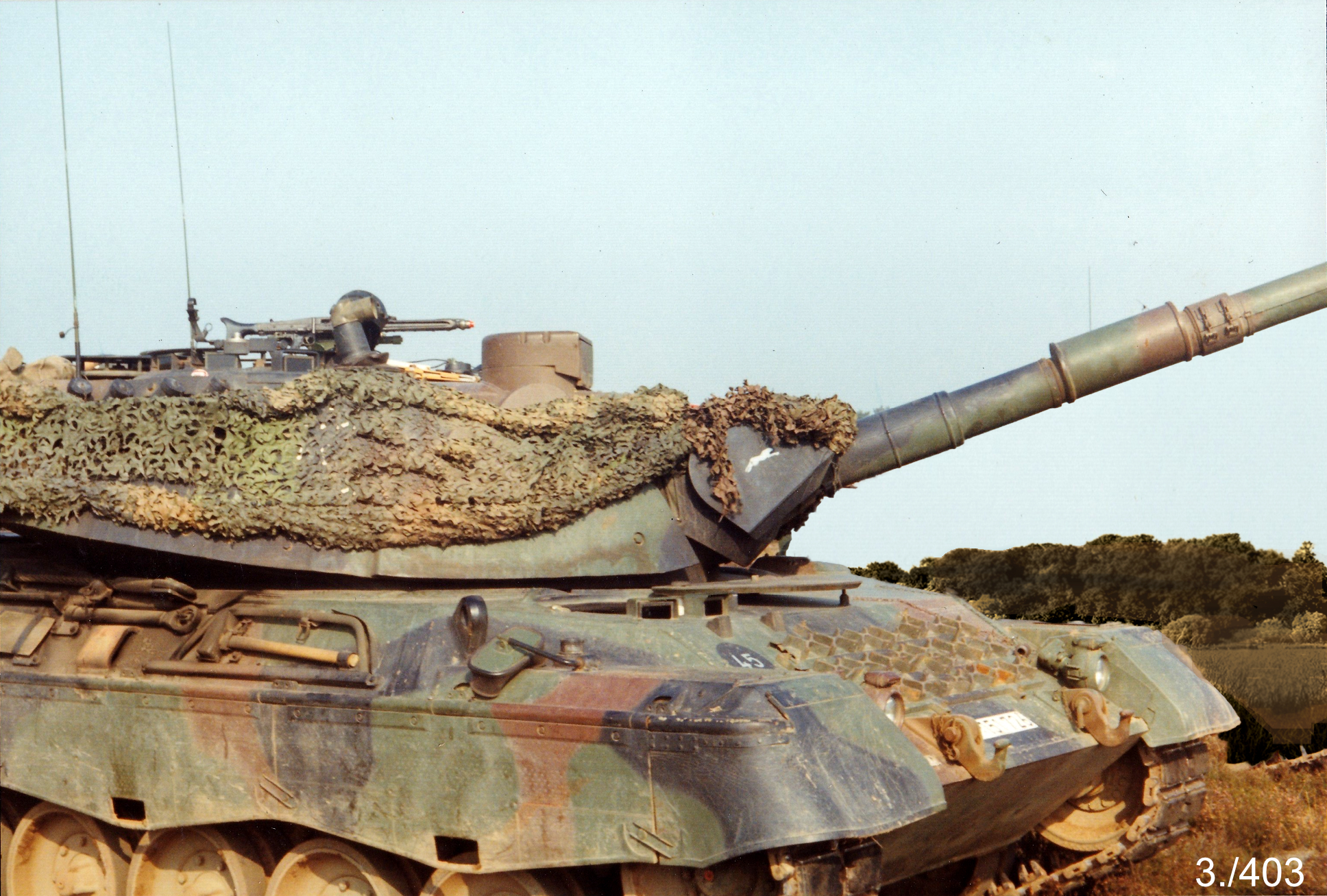 ausschließlich in Bezug zur Fahrzeugwanne stabil halten kann. Im unteren Drittel des Rechnerbediengerätes befinden sich die Potentiometer zum Einstellen des Systemfehlers in Höhe und Seite. Dieses Feld ist bei Nichtbenutzuung durch eine aufsteckbare Gummikappe geschützt. Die jeweiligen Systemfehlerwerte werden für die verwendeten Geschossarten während des Anschießens der Kanone ermitttelt. Ursächlich dafür ist, dass aus technologisch und ballistisch unvermeidlichen Gründen jede Kanone eines jeden Kampfpanzers für die unterschiedlichen Geschossarten unterschiedliche Koordinatenwerte des mittleren Treffpunktes in Bezug zum zielmittigen Justierkreuz aufweist. Der ballistische Rechner berücksichtigt nun diese über das Bedienpult eingespeicherten Systemfehlerwerte um die abweichenden mittleren Treffpunkte durch automatische Korrekturen in Seite und Höhe zu kompensieren. Dadurch kann der Richtschütze für jeden Geschosstyp den gleichen Haltepunkt anwenden. Für den Rechner stehen Speichersteckplätze für sechs Geschosstypen zur Verfügung die in zwei Bereiche gesplittet sind. Auf jedem Speicherplatz sind alle ballistischen Daten eines Geschosses der jeweiligen Schusstafel hinterlegt. Der Ladeschütze kann zwischen den Bereich 1 bzw. 2 wählen und durch Betätigen der jeweiligen Munitionstypentaste den entsprechenden Datenspeicher zuschalten. Das gemeinsam mit dem Tagessichtkanal in das EMES integrierte Wärmebildgrundgerät WBG-X, das auch die eigentliche Wärmebildkamera enthält, wurde seit 1980 im Unternehmen Zeiss-Eltro Optronic, später die Firma Hensoldt, in Serie gefertigt. Die Wärmebildkamera mit einer nutzbaren Wellenlänge von 8 bis 14 Mikrometer beruht auf einer Lizenz der Firma Texas-Instruments. Das Wärmebildgrundgerät wird neben der Optischen Verbindungsbaugruppe von unten an die Ausblickbaugruppe angebaut. Auch die optische Verbindung zur Okularbaugrppe erfolgt durch die Verbindungsbaugruppe. Die Beobachtung wird in der Regel über das große Sichtfeld mit etwa 4-facher Vergrößerung geführt. Vier Winkel, welche die Eckpunkte eines Rechtecks bilden, zeigen dem Schützen den Beobachtungsbereich des engen Sichtfeldes. Zm Schießen wird in der Regel auf das enge Sichtfeld von etwa 12-facher Vergrößerung umgeschaltet. Das Strichbild entspricht dem des Tagkanals. Der einzige Unterschied besteht darin, dass das zentrale Richtkreuz mit separaten Strichen dargestellt wird, während die Striche im Tagkanal durch einen Kreis verbunden sind. Zur Inbetriebnahme des Wärmebildgerätes muss der Schalter BEREIT am Bedienfeld für das Wärmebildgerät eingeschaltet werden. In der Bereitschaftsstufe beginnt der Stirling-Kühler des Wärmebildsensors das Sensorfeld auf etwa -196 Grad Celsius abzukühlen. Nach etwa 10 Minuten kann der Betriebsartenschalter aus der Stufe BEREIT in die Stufe EIN geschaltet werden. Die volle Betriebstemperatur -196 Grad Celsius wird nach etwa 20 Minuten erreicht. Zur Steuerung der Waffenrichtanlage nutzt der Richtschütze die Richtgriffbaugruppe direkt vor seinem Sitzplatz. Im Unterschied zur selben Baugruppe beim Leopard 1A2 wird hier die Waffenricht-und stabilisierungsanlage ausschließlich über elektrische Ausgangssignale gesteuert, die in die Stabilisierungselektronik eingespeist werden. Vorne oben an den beiden Richtgriffen befinden sich Wipptaster, deren Funktionalität am linken bzw rechten Richtgriff identisch sind. Beim Tasten auf