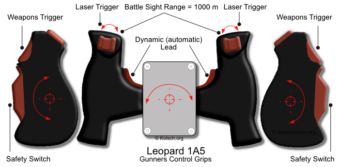 der jeweils äußeren Seite wird der Laserentfernungsmesser ausgelöst. Wird die innere Seite der Wippe betätigt, dann schaltet die Feuerleitanlage in den Modus Battle Sight Range um. Dabei beträgt die eingestellte Schussweite 1000 m. Die Flugbahnhöhe beträgt in diesem Fall für APFSDS-Geschosse maximal etwa 0,6 m und fällt ab 1000 m bis 1500 m weitere etwa 0,5 m ab. Der Richtschütze kann auf diese Weise notfalls alle Ziele im Entfernungsbereich bis etwa 1500 m mit Haltepunkt Zielmitte anrichten und treffen,
